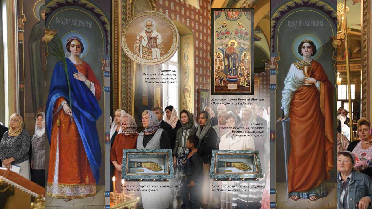 В храме Вознесения Господня исторически сложился уникальный ансамбль фресок и иконографических изображений. В одном храмовом пространстве перед нами предстают 29 женских образов: Елизавета, Анна, Фотиния, Екатерина, Варвара, Анастасия, Ирина, Тамара, Нина, Людмила, Александра, Елена, Мария, Параскева, Иустинья, Татиана, Марфа, Сусанна, Иоанна, Галина, Дарья, Виктория, Таисия, Ксения, Матрона, Вера, Надежда, Любовь, София.